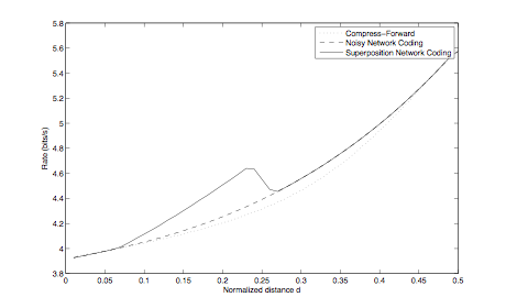 The achievable rate region is derived for a Gaussian two way relay channel. The graph shown below compares the rates achieved by different encoding schemes as a function of normalized relay distance from the source. It can be observed that the superposition noisy network scheme achieves rates higher than the existing schemes in general.