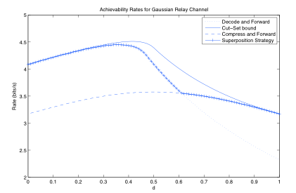The graph shows the rates achieved by different encoding schemes as a function of normalized relay distance from the source. It can be observed that the superposition forward scheme achieves the maximum of rates achieved by compress-forward or decode-forward.